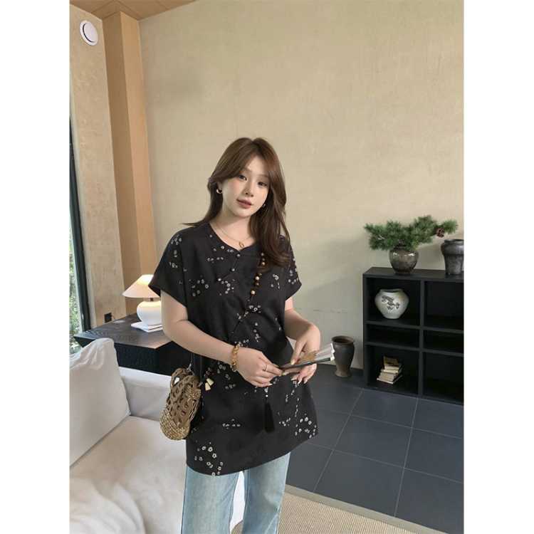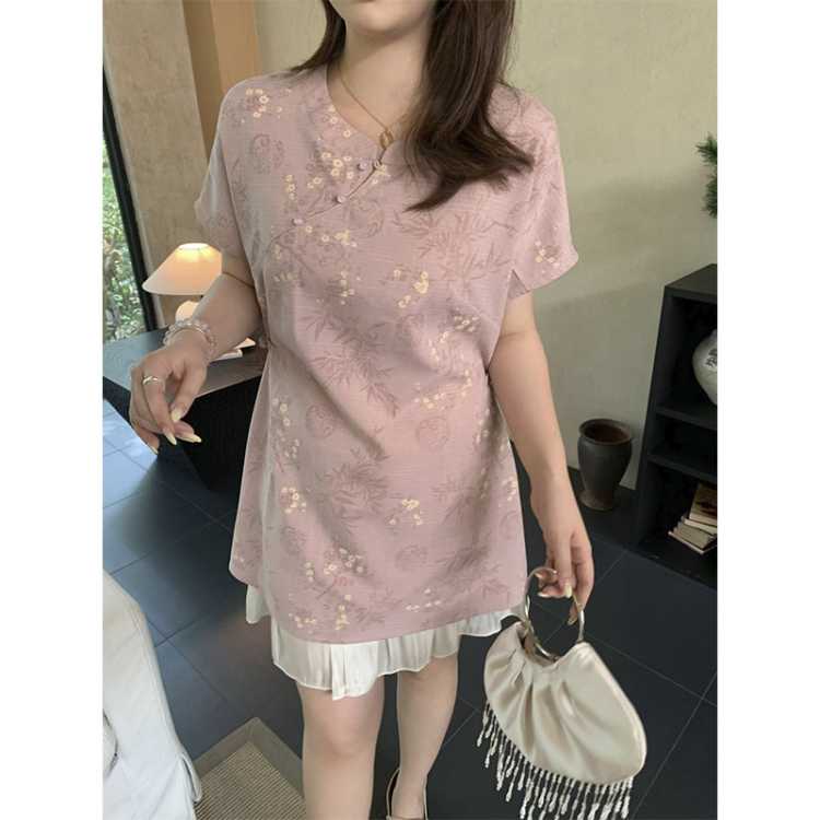 大婉醬 微胖大碼女款國風提花襯衫時尚斜襟圓領短袖上衣新中式短款旗袍