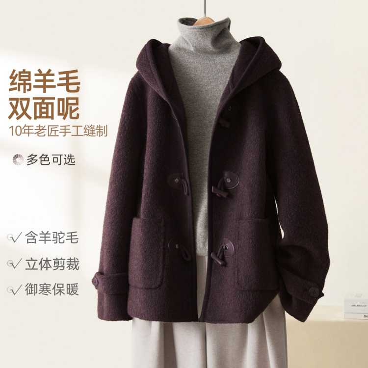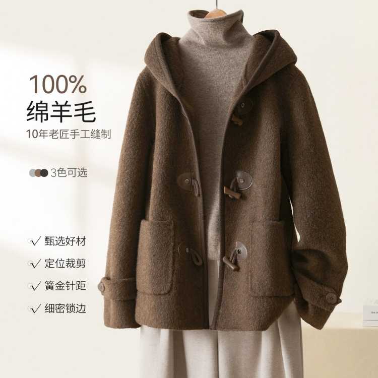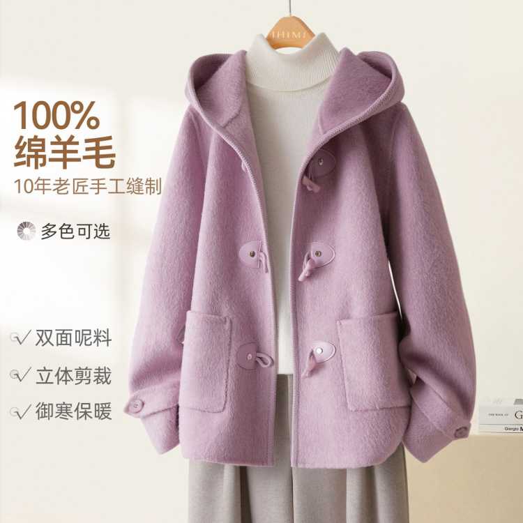 IHIMI海謐 【高品質棉羊毛雙面呢】高級感連帽短款手工雙面羊毛春冬毛呢大衣