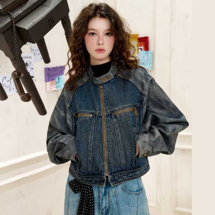 COOLHUT 美式牛仔拼接休閑立領春季女式外套顯瘦PU撞色