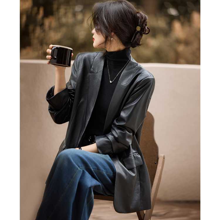 安乃安 【蛋白皮皮衣女】春夏款老錢風高級感PU皮無領時髦寬松西裝外套