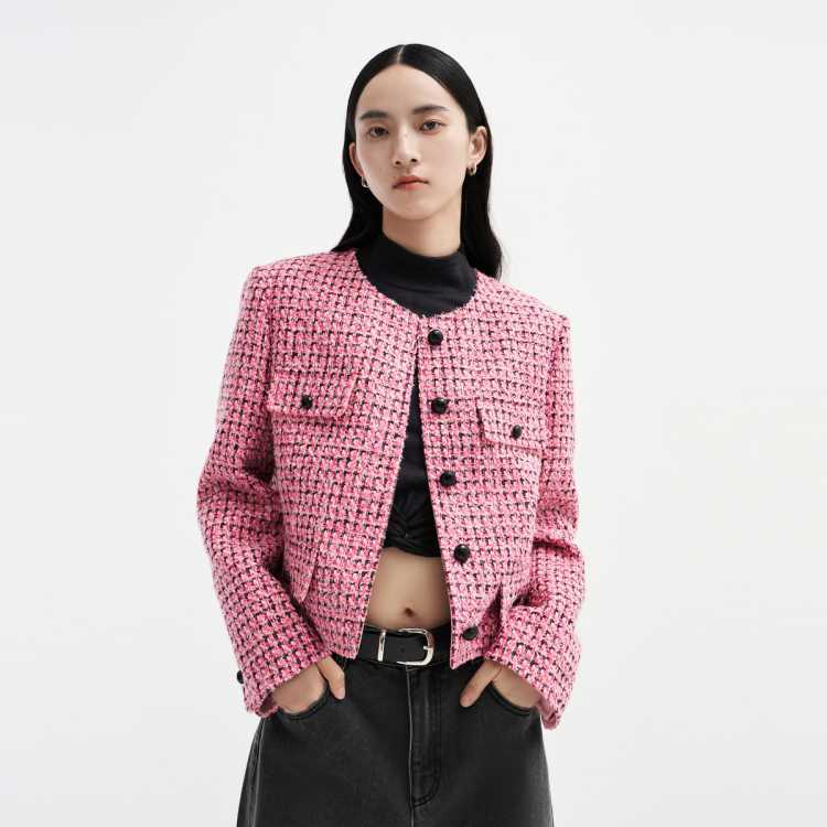 H S 花紗小香風外套早春女裝粉色粗花呢高級感短款上衣